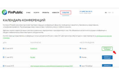 Компания Finpublic в рамках обновления сайта запустила новый раздел «Календарь конференций», где каждый желающий может следить за повесткой предстоящих конференций и добавлять в свой план наиболее интересные мероприятия.